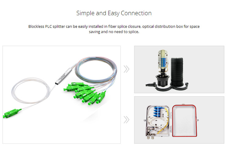 Blockless PLC splitter has stronger fiber protection than bare fiber splitter, which is a miniaturization result of cassette splitter. It's mainly used for various connection and distribution boxes or network cabinets.